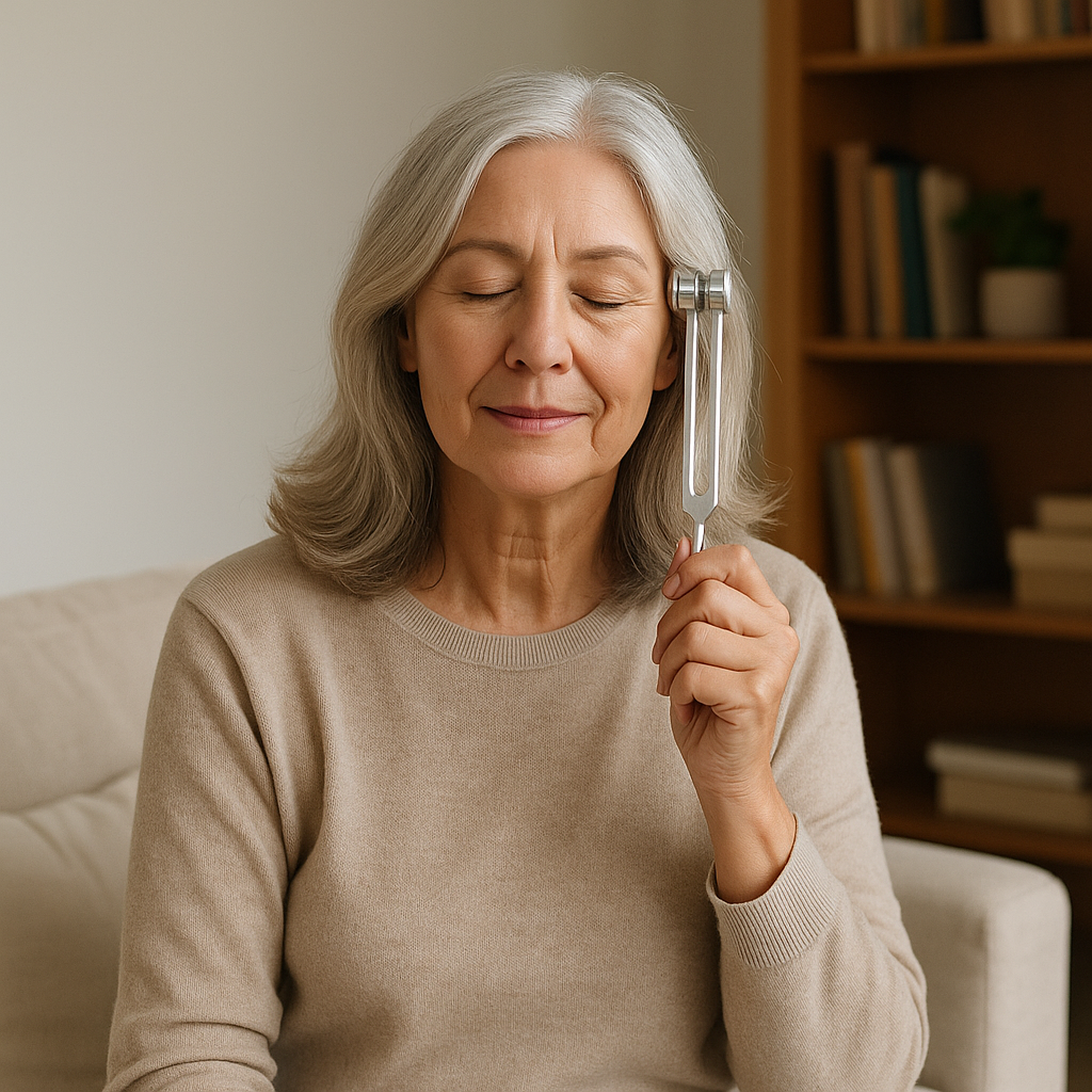 This simple, science-based tool uses soothing sound + 128 Hz vibrations to calm your nervous system, ease tension, and restore balance — all from the comfort of your home.